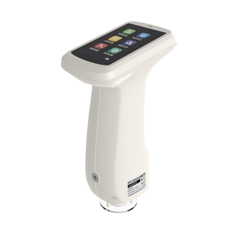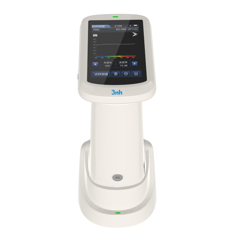 分光反射率:MAV/SCI,标准偏差0.1%以内(400~700nm:0.2%以内)台间差 MAV/SCI,ΔE*ab 0.4以内(BCRA系列Ⅱ 12块色板测量平均值) 显示精度 0.01 反射率测定范围 0-200% 反射率分辨率 0.01% 测量方式 单次测量,平均测量(2~99次) 定位方式 稳定片定位+摄像头取景定位 白板校验方式 接触式白板校验 尺寸 120*75*207mm 重量 367g(不含校正底座) 电池电量 锂电池,3.7V,3200mAh,8小时内8000次 照明光源寿命 10年大于120万次测量 显示屏 TFT 真彩 3.5inch,电容触摸屏 接口 USB,蓝牙 存储数据 标样500条,试样10000条(一条数据可同时包括SCI/SCE),APP/PC海量存储 软件支持 Android,IOS,Windows,微信小程序,鸿蒙 语言 简体中文,English,繁体中文 操作温度范围 0~40℃,0~85%RH(无凝露),海拔:低于2000m 存储温度范围 -20~50℃,0~85%RH(无凝露) 准确性保证 保证一级计量合格 标准附件 电源适配器、数据线、说明书、品质管理软件(官网下载)、白校正盒、保护盖、腕带、测量口径 可选附件 微型打印机、粉末测试盒 注: 如有变更,恕不另行通知